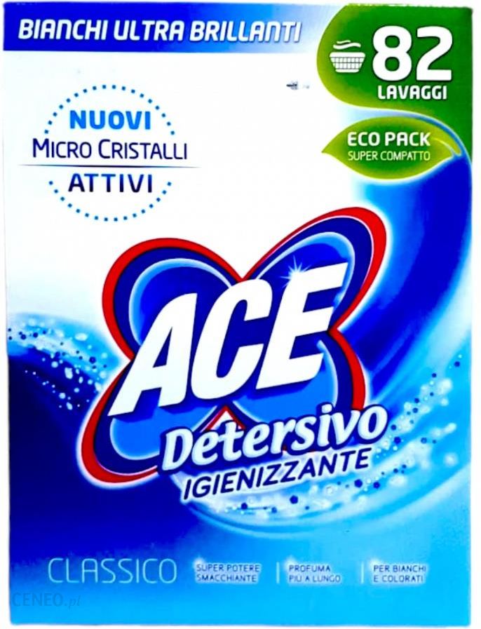 ACE uniwersalny proszek do prania z Włoch, idealny do białych i kolorowych ubrań dla całej rodziny. Proszek ACE Sanitizing Detergent zapewnia głębokie czyszczenie i świeży zapach, który utrzymuje się dłużej. Skutecznie usuwa plamy nawet w niskich temperaturach, dezynfekuje i czyści pranie z zachowaniem struktury tkanin i kolorów. Dodatkowo dzięki specjalnej formule z aktywnymi mikrokryształkami nadaje ultra blasku i ożywia biel.ACE włoska chemia w najlepszym wydaniu.Pojemność: 5,33 KGWydajność: 82 prania