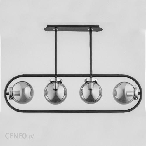Lampa wisząca 4 punktowa ze szklanymi kloszami. Elementy metalowe wykończone w kolorze czarnym z chromowanymi wstawkami. Możliwość podłączenia lampy tak, aby świeciły dwie żarówki lub dwie lub wszystkie (pod warunkiem, że instalacja w pomieszczeniu jest rozdzielona na 2 obwody). Lampa pasuje zarówno do nowoczesnego i eleganckiego wnętrza.