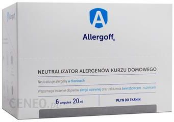 Opis:Allergoff płyn to preparat neutralizujący alergeny i pasożyty.Działanie i zastosowanie:neutralizuje i usuwa alergeny oraz pasożytyobniża ryzyko przeniesienia kleszczy w środowisko domowedziała ochronnie przez 1 miesiącskuteczny wobec alergenów podczas prania w temperaturze poniżej 60°Cneutralizacja alergenów kurzu domowego – roztocze kurzu domowego, wesz odzieżowazalecany do stosowania podczas chorób pasożytniczych skóry – nużeniec, świerzbowiecmoże być także stosowany do neutralizacji alergenów w legowiskach zwierząt domowych – pchła, kleszczNeutralizuje i usuwa alergeny z tkanin (pościeli, kołder, ręczników, kocy, ubrań). Wspomaga leczenie objawów alergii wziewnej oraz leczenie chorób pasożytniczych skóry powodowanych przez świerzbowca oraz nużeńca.Skład:Alkohol benzylowy, benzoesan benzylu.Sposób użycia i dawkowanie: Allergoff płyn należy stosować do namaczania tkanin poprzedzającego pranie ręczne lub w pralce. Jedna ampułka wystarcza na ok. 5 kg prania.Etap I namaczanie:Rozpuścić całą zawartość ampułki w 20 litrach wody (w misce lub wannie). Temperatura wody przeznaczonej do namaczania powinna byćodpowiednio dobrana do rodzaju tkaniny. Moczyć pranie przez 2 godziny.Etap II pranie ręczne lub maszynowe:W przypadku prania ręcznego po 2 godzinach kontynuować pranie z użyciem proszku lub innych środków piorących. W przypadku prania maszynowego przełożyć mokre tkaniny do pralki i kontynuować pranie. Pranie należy kontynuować przy użyciu najmniejszej dawki środka piorącego, podanej przez producenta na opakowaniu. Zaleca się wykonanie dodatkowego płukania.Zawartość opakowania:1 opakowanie zawiera 6 ampułek (po 20 ml każda).Przechowywanie:Przechowywać w miejscu niedostępnym dla dzieci, w temperaturze pokojowej, chroniąc od światła i wilgoci.