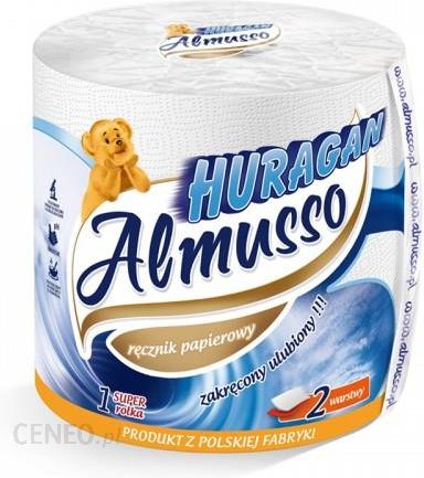 Ręcznik papierowy Huragan Almusso Dwuwarstwowy Wykonany z dwóch warstw bibułki celulozowej – 100% celuloza. Ręcznik kuchenny, który może znaleźć szerokie zastosowanie w domu, w ogrodzie, w samochodzie i w warsztacie. Testowany dermatologicznie i alergologicznie. Dopuszczony do kontaktu z żywnością. Obojętne PH. Surowiec: 100% celuloza Ilość warstw: 2 Gramatura: 2×17,5 g/m2 Ilość listków: 300 szt. Długość listka: 20 cm Średnica/wysokość rolki: 190/222 mm Ilość rolek: 1 szt.