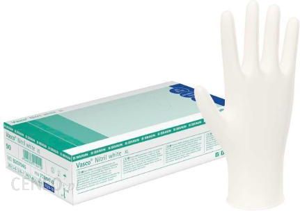 Nitrylowe rękawice bezpudrowe w kształcie uniwersalnym, kolor biały. Rozmiar XL.