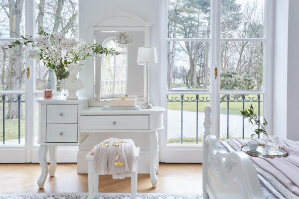 Elegancka biała toaletka z lustrem Carly. Wymiary: 128 x 45 x 173 cm. Cechy: duże prostokątne lustro w ozdobnej ramie, 3 szuflady przy blacie, profilowane nogi, frezowane fronty, kolorowe gałki. Materiał: płyta MDF lakierowana na kolor biały. Kolekcja stylowych mebli Victoria.