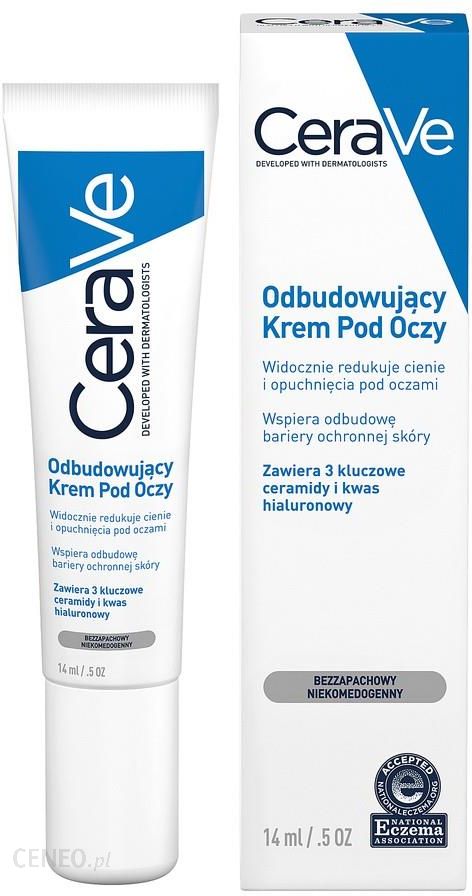 Odbudowujący Krem pod Oczy CeraVe o działaniu odbudowującym, którego formuła powstała dzięki współpracy z dermatologami. Jego starannie opracowany skład wzbogaca kwas hialuronowy oraz kompozycja 3 kluczowych dla skóry ceramidów. Krem nawilża oraz zmniejsza widoczność cieni i opuchnięć pod oczami, dbając jednocześnie o odbudowę warstwy ochronnej skóry. Jego niekomedogenna formuła jest także bezzapachowa.CERAVE to kompozycja trzech ceramidów o budowie identycznej z ceramidami zawartymi w skórze: ceramid 1, ceramid 3, ceramid 6-II, a także cholesterolu, kwasów tłuszczowych i fitosfingozyny. Składniki te wykazują działanie synergiczne w odbudowie bariery ochronnej skóry.Technologia (MVE) (Multivesicular Emulsion Technology) umożliwia stabilne w czasie uwalnianie składników aktywnych, w tym niezbędnych ceramidów, aby pomóc w odbudowaniu bariery ochronnej skóry, dzięki czemu pozostaje ona nawilżona na dłużej.Wskazania:CeraVe Odbudowujący Krem pod Oczy dla skóry normalnej i suchej. Dla dorosłych i dzieci od 3 roku życia.WIDOCZNIE REDUKUJE CIENIE I OPUCHNIĘCIA POD OCZAMIWSPIERA ODBUDOWĘ BARIERY OCHRONNEJ SKÓRYZAWIERA 3 KLUCZOWE CERAMIDY I KWAS HIALURONOWYWłaściwości: