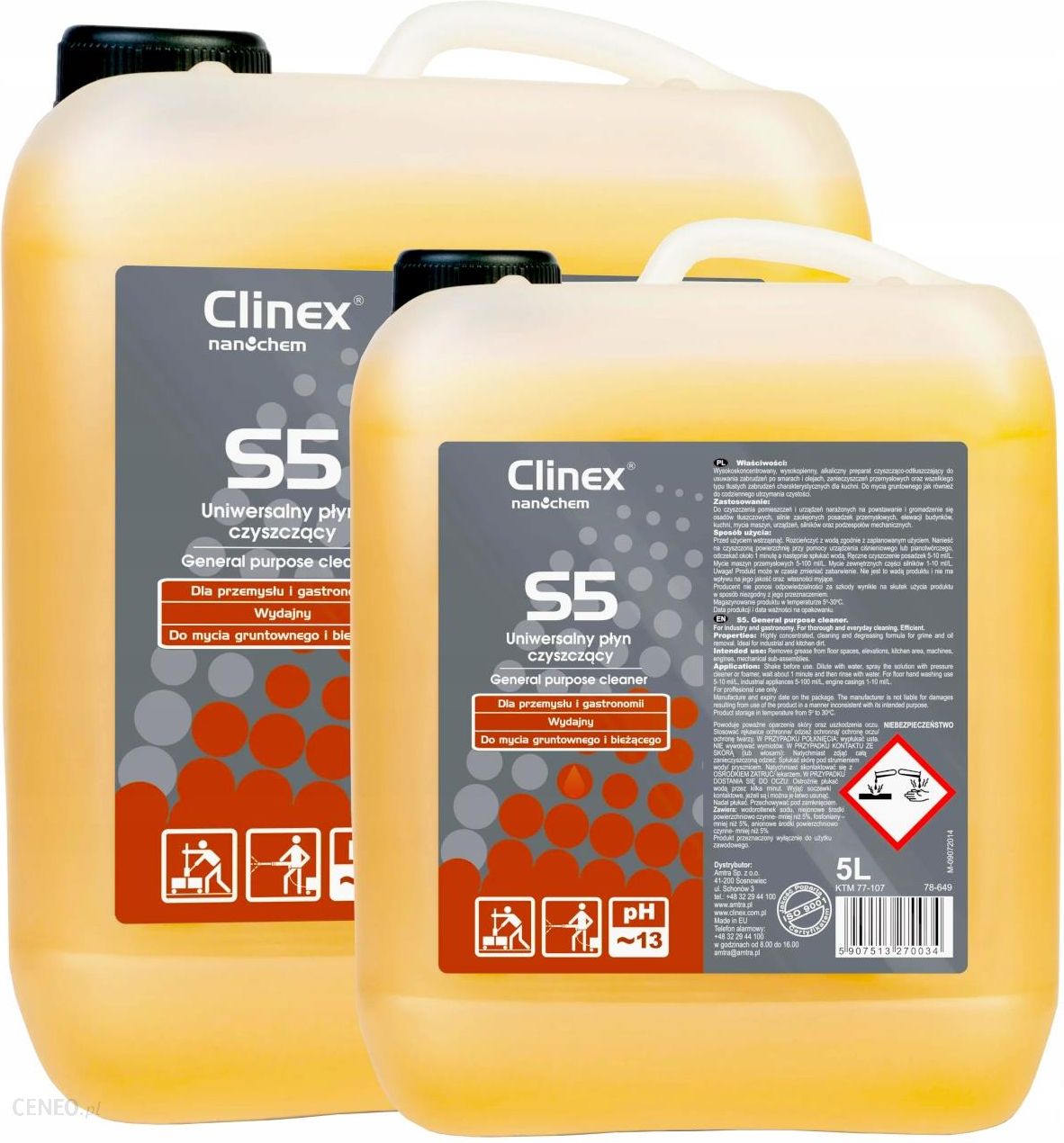 CLINEX S5 20 L Uniwersalny, odtłuszczający preparat czyszczący. Właściwości produktu Wysokoskoncentrowany, uniwersalny płyn czyszczący przeznaczony do usuwania wszelkiego rodzaju uporczywych zabrudzeń. Poprzez zastosowanie różnych rozcieńczeń z wodą doskonale nadaje się do mycia gruntownego jak również do codziennego utrzymania czystości.Zastosowanie: Do doczyszczania silnie zaolejonych posadzek przemysłowych, elewacji budynków, mycia maszyn, urządzeń, silników oraz podzespołów mechanicznych i samochodowych. Sposób użycia Przed użyciem wstrząsnąć Rozpuścić z wodą, roztwór rozpylić przy pomocy urządzenia ciśnieniowego lub pianotwórczego, odczekać około 1 minuty a następnie spłukać wodą Czyszczenie posadzek 5-50ml/1lL Mycie maszyn przemysłowych 5-100ml/1lL Mycie części zewnętrznych silników 1-10ml/1L Uwaga: Produkt może po czasie zmieniać zabarwienie (na ciemno słomkowe). Magazynować produkt w temperaturze od 5-30°C.