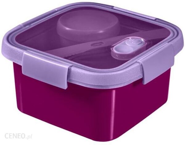 Kwadratowy pojemnik na lunch z kolekcji Smart To Go o pojemności 1,1 l. Będzie idealny do przechowywania lunchu w postaci dań z makaronem, sałatki, gulasz lub leczo. Na ruchomej półeczce możesz postawić pieczywo, a w pojemniczku z zakrętką zabrać ulubiony sos lub dip. Przezroczysta pokrywa pozwoli Ci na sprawdzenie zawartości bez konieczności otwierania pojemnika. Szczelne zamknięcie na zatrzaski pozwoli Ci na zabranie pojemnika ze sobą w torbie czy plecaku, bez obaw o wydostanie się zawartości na zewnątrz. Wykonany z wysokiej jakości tworzywa sztucznego, wolnego od BPA, w kolorze fioletowym. Wytrzymałe tworzywo pozwala na użycie pojemnika w zamrażalniku, a specjalnie wbudowany wentyl powietrza umożliwi podgrzewanie posiłków w mikrofalówce. W komplecie znajdują się:- lunchbox o pojemności 1,1 l- poprzeczna półeczka- sztućce- pojemniczek na sos.Znakomity do pracy, szkoły oraz w każdym miejscu do którego się wybierasz.Kolekcja:Smart To GoWymiary :wysokość – 9 cmdługość – 16 cmszerokość – 16 cmpojemność – 1,1 lMateriał:tworzywo sztuczneMożliwość mycia w zmywarce:tak
