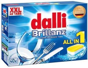Dalli Brillanz myje za pomocą bardzo aktywnych substancji – usuwają uporczywe i zasuszone zabrudzenia. Aktywny nabłyszczasz nadaje perfekcyjny połysk i zapobiega powstawaniu smug na szklankach i naczyniach. Specjalna funkcja soli wiąże wapń i chroni zmywarkę i naczynia od szkodliwych osadów. Długotrwała ochrona szkła zapobiega jego korozji i nadaje mu długotrwały blask. Zintegrowana ochrona srebra redukuje utlenianie posrebrzanych sztućców. Zmywarka pachnie świeżo po każdym zmywaniu. Nieprzyjemne zapachy są neutralizowane.Opakowanie zawiera: 40 szt.