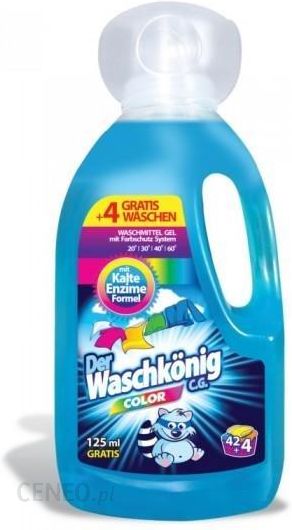 Wysokiej jakości niemiecki żel do prania tkanin kolorowych Der Waschkönig C.G. Color. Skoncentrowana formuła sprawia, że 1,625 litra żelu wystarcza na wykonanie nawet 46 prań (125 ml, czyli 4 prania są gratis!).Der Waschkönig C.G. Color efektywnie pierze tkaniny, usuwając uciążliwe zabrudzenia nawet w niskich temperaturach, a do tego chroni kolory tkanin, dzięki czemu dłużej wyglądają jak nowe. Żel dzięki swojej sile oraz nowoczesnej formule radzi sobie z zabrudzeniami już w temperaturze 20°C. Do tego bardzo łatwo rozpuszcza się w wodzie nie pozostawiając zacieków. Nadaje praniu delikatny, przyjemny zapach.Dzięki zastosowanej w nim formule włókna tkanin zostają wygładzone, co sprawia, że brud trudniej się na nich osadza, a powstałe zabrudzenia są łatwiejsze do usunięcia.Żel Der Waschkönig C.G. Color w swoim składzie posiada środki chroniące elementy pralek przed korozją oraz osadzaniem się kamienia. Do żelu dodawana jest miarka gratis.