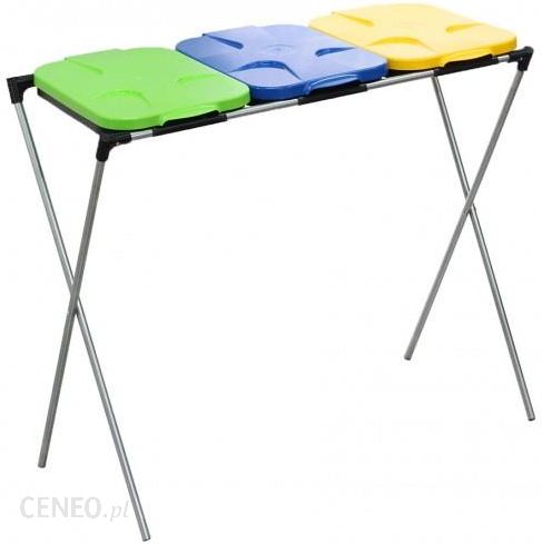 Stojak do segregacji odpadów (3-stanowiskowy) żółty, zielony, niebieski Stojaki Są produkcji polskiej firmy. Klapy są równe i sztywne, rozkładane nogi są ocynkowane. Na końcach nóżek założone są plastikowe zaślepki zapobiegające rysowaniu podłoża. W stojaku zamontowane są trzy pokrywy oraz pod nimi czarna obręcz służąca do mocowania i przytrzymywania worków w stelażu. W stojakach można stosować worki o pojemnościach od 120 do 240 litrów. Specyfikacja: Wysokość: 82 cm Szerokość: 96 cm Głębokość: 42 cm Liczba stanowisk: 3 Kolor: żółty, zielony, niebieski Możliwość stosowania worków od 120 do 240 litrów Nasze stojaki To doskonała jakość i bardzo przystępna cena! Klapy wykonane są z błyszczącego plastiku, kolory są żywe! Stojak na śmieci z trzema pokrywkami w kolorach: żółty, zielony i niebieski , umożliwia segregację odpadów na plastik, szkło i papier. Pokrywy stojaka można zdejmować, co znacznie ułatwia ich czyszczenie. Ponadto stelaż się składa i można go wygodnie przechowywać lub przewozić.