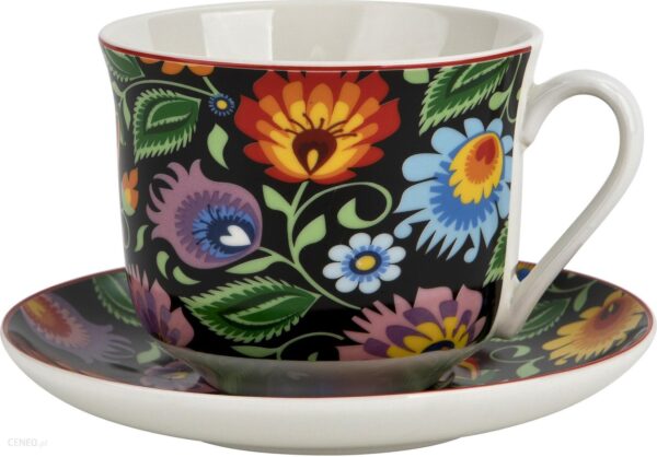 Filiżanka jumbo 470 ml ze spodkiem ETNIC wchodząca w skład serii Etno, wykonana z porcelany New Bone China, charakteryzującej się elegancką i naturalną kremowo – białą barwą z delikatnym połyskiem, a także wyjątkową wytrzymałością.Linia charakteryzuje się białym kolorem wewnątrz oraz zdobiona regionalnymi, wyrazistymi kolorowymi wycinankami w kształcie kwiatów i pawich oczek na intensywnie czarnym tle.Całość zapakowana w ozdobne pudełko dekorowane tym samym motywem to doskonały pomysł na niebanalny prezent.Wymiary:Filiżanka: 13 cm x 10,5 cm x 8,5 cm Spodek: śr. 16 cm x 2,5 cm