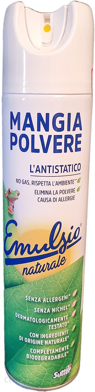 Emulsio MangiaPolvere AntystatycznyNaturalnyPodwójna skuteczność przeciw kurzowi – HipoalergicznyEkskluzywna formuła Emulsio MangiaPolvere Natural nie tylko eliminuje kurz z mebli bez rozpraszania go w powietrzu, ale tworzy barierę antystatyczną, która nie pozwala mu osiadać przez wiele dni!Dodatkowo usuwa również alergeny odpowiedzialne za dokuczliwe alergie!Dzięki 98% składników pochodzenia naturalnego, przebadanych dermatologicznie, bez niklu i z zapachami bez alergenów, jest również idealny dla najbardziej wrażliwych osób!MangiaPveri è Eco Lover *:- Opakowanie w 100% nadające się do recyklingu- Technologia sprężonego powietrza szanująca środowisko!SPOSÓB UŻYCIA:Wstrząsnąć przed użyciem.TRZYMAJ PUSZKĘ W POZYCJI PIONOWEJ i spryskaj produkt bezpośrednio na miękką szmatkę z odległości 15 cm, a następnie odkurz.NIE PRZEKRĘCAĆ KAPTURKĄ.Aby zwiększyć skuteczność, należy regularnie spryskiwaćszmatkę podczas odkurzania.