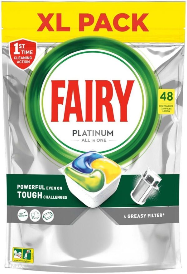 Tabletki do zmywarki All In One Fairy Platinum działają już przy 1. myciu i usuwają nawet trudne zabrudzenia, pozostawiając naczynia czyste i lśniące. Dzięki sile działania tabletek do zmywarki Fairy Platinum możesz bez obaw przygotowywać wszelkie posiłki, wiedząc, że poradzą sobie nawet z tłustym filtrem, a naczynia i zmywarka będą czyste i pachnące świeżością. Tabletki do zmywarki Fairy to połączenie płynu i proszku w jednej wydajnej kapsułce. Nasze kapsułki rozpuszczają się niezwykle szybko, dzięki czemu od razu zaczynają działać. A ich użycie jest bardzo proste. Nie musisz ich rozpakowywać. Wystarczy umieścić je w dozowniku detergentu zmywarki do naczyń. Tabletki do zmywarki Fairy Platinum usuwają nawet trudne zabrudzenia już przy 1. myciu Pomagają zapobiegać osadzaniu się tłuszczu w zmywarce i czyszczą zatłuszczony filtr Zastosowanie soli i ułatwione płukanie wraz z ochroną szkła i srebra Zmywarka jest czysta i świeżo pachnie Tabletki rozpuszczają się niezwykle szybko