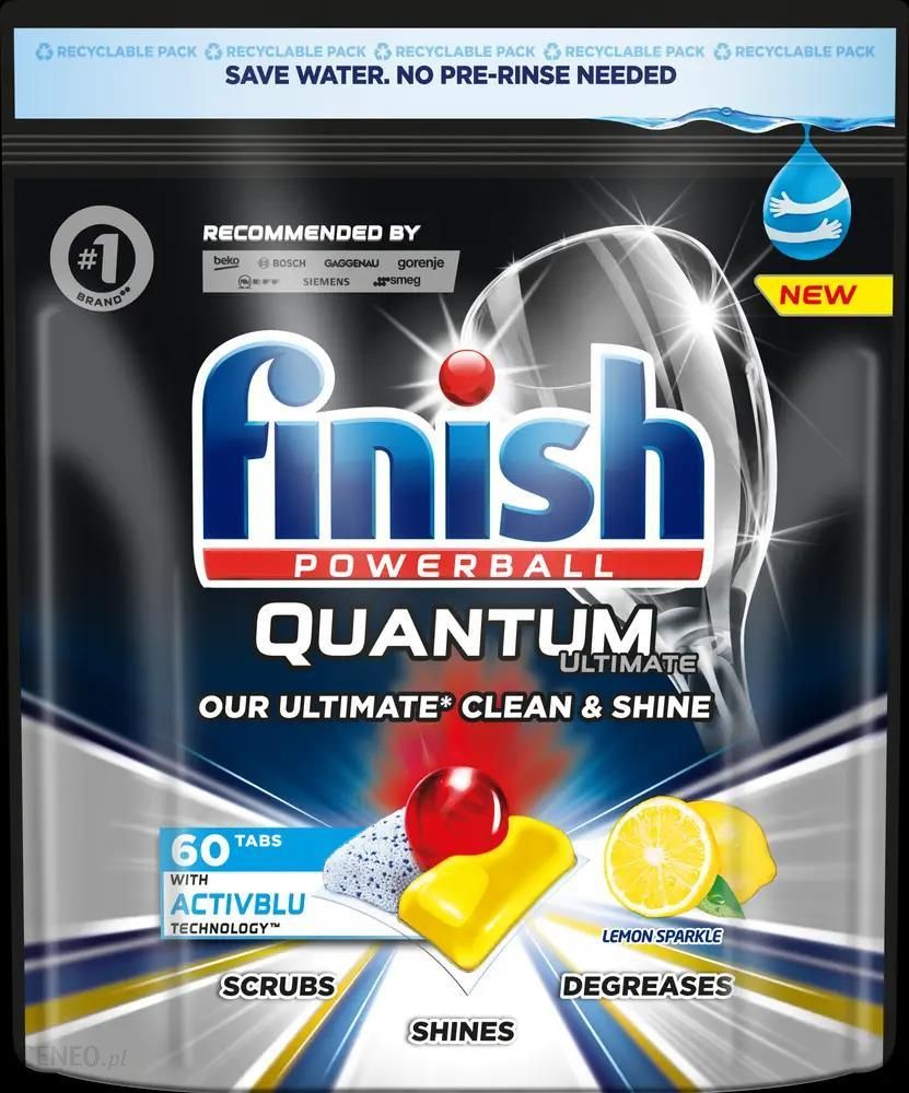 Kapsułki do zmywarki Finish Quantum Ultimate Lemon Sparkle zapewniają niezrównaną czystość i połysk. Komora z proszkiem efektywnie usuwa zaschnięte resztki jedzenia, kulka powerball zapewnia doskonały połysk, a żel radzi sobie z najbardziej odpornym tłuszczem. Powłoka kapsułek została wykonana z biodegradowalnego materiału, który w 100% rozpuszcza się w wodzie.