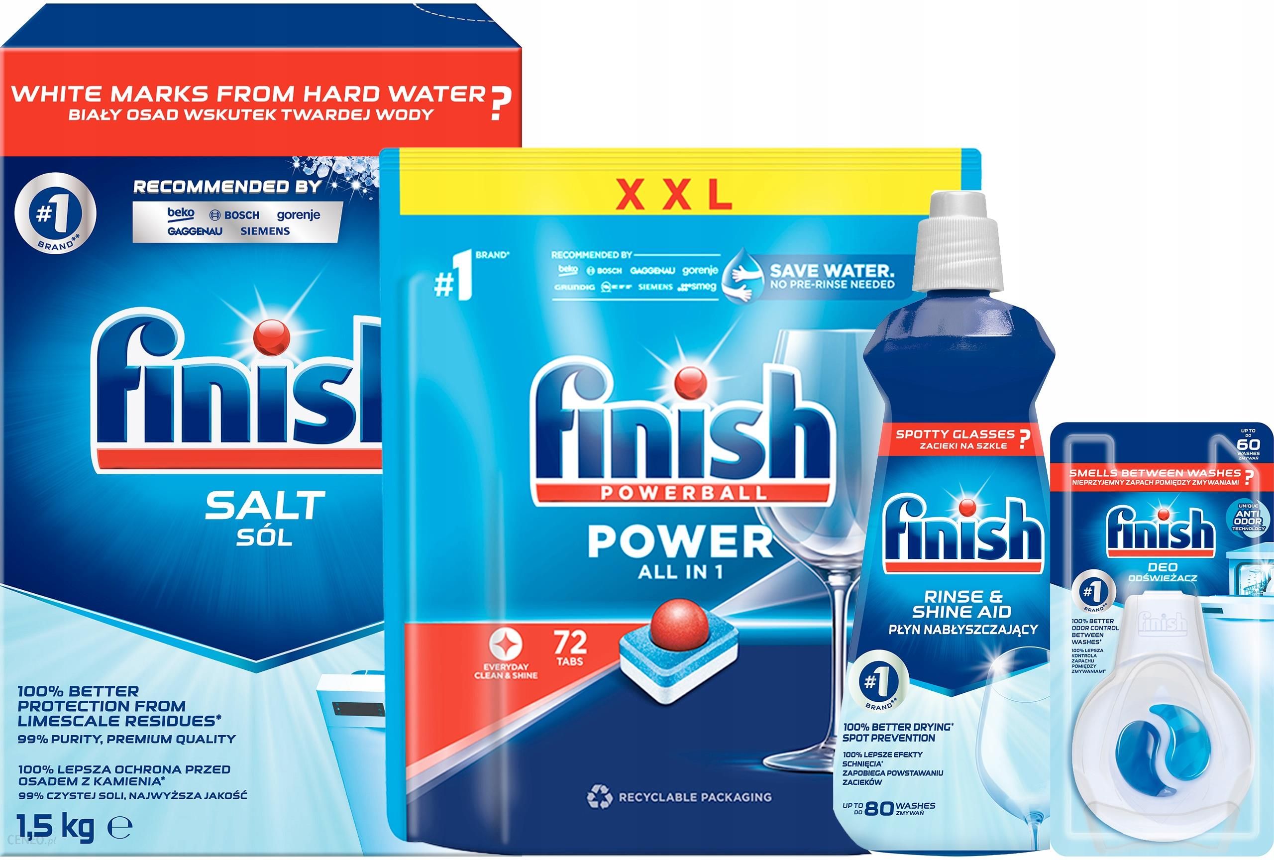 Zestaw Finish All in 1 TabletkiUWAGA!!! PRODUCENT JEST W TRAKCIE ZMIANY OPRAW GRAFICZNYCH – PRODUKT WYSYŁANY W AKTUALNEJ SZACIE GRAFICZNEJ!!UWAGA PRODUCENT NIE UMIESZCZA NA OPAKOWANIU NAPISU „MAX”Zestaw zawiera:1x Finish All in 1 Tabletki do Zmywarki 72 sztuk Regular1x Finish Nabłyszczacz do Zmywarki 400ml Regular1x Finish Zapach do Zmywarki Powiew Świeżości1x Finish Sól do Zmywarki Zmiękczająca Wodę 1,5 kgFinish All in 1 Tabletki do Zmywarki 72 sztuk REGULARCechy produktu53szt. w opakowaniu;formuła Powerball;funkcja soli i nabłyszczacza;usuwanie tłuszczu;ochrona filtrów i szkła;ochrona przed osadami z kamienia;świeży zapach;10 Funkcji !Żelowe tabletki do zmywarki All in 1 działają w 10 obszarach. Skutecznie eliminują zabrudzenia i usuwają ciężkie plamy np. z herbaty czy tłuszczu. Dodatkowo chronią filtry oraz szkło i zapobiegają osiadaniu kamiennego osadu na naczyniach.All in 1 działają w niskich temperaturach, mają funkcję soli i nabłyszczacza. Dzięki formule Powerball usuwają także przypalone jedzenie i nadają naczyniom olśniewający blask.Formuła PowerballWzbogacona o nowe składniki formuła Powerball zwiększa moc tabletki i zapewnia doskonałą czystość oraz olśniewający blask naczyń. Poszczególne elementy tabletki, zaprojektowane są tak, by aktywować się na różnych etapach zmywania, zapewniają kompleksowe czyszczenie.Finish Sól do Zmywarki Zmiękczająca Wodę 1,5 kgFinish Sól do zmywarki gruboziarnista 1,5kg. Po zastosowaniu soli naczynia są bezwzględnie czyste, posiadają kryształowy połysk i blask. Stosowanie soli przy każdym zmywaniu chroni zmywarkę przed osadzaniem się kamienia.Środki zawarte w soli do zmywarek Finish zmiękczają wodę i chronią zmywarkę przed korozją.Sól do zmywarek Finish znacznie zwiększa efektywność tabletek i efektywność zmywarki.Cechy ProduktuZmiękcza wodę;Redukuje Kamień;Eliminuje Zacieki;Ochrona filtrów i spryskiwaczy;Poprawienie działania zmywarkiFinish Nabłyszczacz do Zmywarki 400ml RegularJeśli Twoja zmywarka skończyła zmywanie i wyjmujesz z niej wciąż mokre naczynia, to znak, że nie używasz płynu nabłyszczającego Finish, który nie tylko eliminuje zacieki, nalot i nadaje połysk, ale również przyspiesza schnięcie naczyń.Dla najbardziej optymalnych efektów używaj płynu nabłyszczającego z tabletkami wielofunkcyjnymi i innymi dodatkami Finish.Nabłyszczacz Finish zawiera środki blokujące odkładanie się nalotów wapiennych, przez co blokuje naloty które odpowiedzialne są za efekt „matowego szkła”. Stosuj nabłyszczacz Finish regularnie, aby twoje naczynia były zawsze krystalicznie czyste.Cechy produktupojemność: 400ml;przyspiesza schnięcie naczyń;nabłyszcza;eliminuje zacieki;świeży zapachFinish Zapach do Zmywarki Powiew ŚwieżościCechy produktu:Zapobiega nieprzyjemnym zapachomDługotrwały świeży zapachOrzeźwiająca, owocowa nutaCzyści i odświeża zmywarkęWystarcza na 60 myćWewnątrz zmywarki, pomiędzy cyklami, może gromadzić się nieprzyjemny zapach. Możemy go odczuć szczególnie wtedy, gdy otwieramy lub zapełniamy urządzenie. Od dzisiaj koniec nieprzyjemnych zapachów w Twojej zmywarce!Najnowsza Technologia Scent Control!Sposób użycia:Wyjmij odświeżacz z opakowaniaZawieś odświeżacz na górnym koszu zmywarki w taki sposób, aby nie blokował ramion spryskiwaczyWymień odświeżacz po 60 cyklach (kiedy zobaczysz, że płyn w odświeżaczu się skończył)Zapraszamy ponownie!
