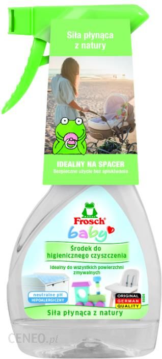 FROSCHBaby – Środek Do Higienicznego Czyszczenia – 300 MlPoznaj innowacyjny produkt marki Frosch Baby. To środek do higienicznego czyszczenia powierzchni. W mgnieniu oka zapewni im olśniewającą czystość, zamieniając codzienne domowe porządki w prawdziwą przyjemność.Idealny do wszystkich powierzchni zmywalnych.Przeznaczenie płynu Frosch BabyPłyn pozwoli Tobie na usunięcie uporczywych zabrudzeń z akcesoriów dziecięcych, takich jak:przewijakikrzesełka do karmienianadające się do mycia zabawki. Właściwości produktu Preparat do higienicznego czyszczenia powierzchni i akcesoriów dziecięcych:posiada delikatną formułę z prowitaminą B5szybko i skutecznie czyści powierzchnie, nadając im krystaliczny blasknie wymaga spłukiwaniajest produktem hipoalergicznymzostał poddany badaniom dermatologicznymnie zawiera substancji zapachowych oraz barwnikówposiada pH neutralne dla skóry.Zastosowanie:Przekręcić dyszę, tak aby symbol oznaczający spryskiwanie / „ON” był ustawiony w górnej pozycji.Rozprowadzić środek bezpośrednio lub nanieść na szmatkę, a następnie wytrzeć do czysta suchą szmatką.Nie wymaga spłukiwania.Frosch baby higieniczne czyszczenie powierzchni- teraz w nowym opakowaniu – o mniejszej pojemnościidealny na czas pandemiiwygodny do zabierania na wszelkie spacery z dziećmi.