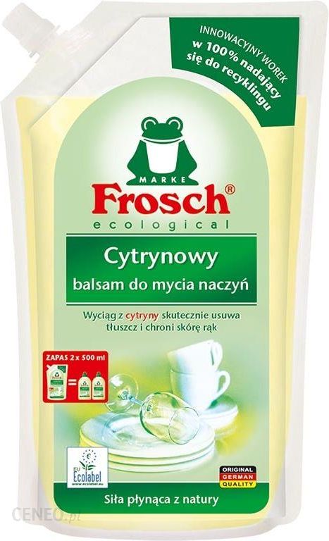 Właściwości- Pozostawia lśniąco czyste naczynia.- Formuła z naturalnym wyciągiem z cytryny skutecznie usuwa tłuszcz i brud. Chroni skórę przed wysuszeniem.- Neutralne pH – produkt testowany dermatologicznie.- Zapas w worku zapewnia oszczędność plastiku w porównaniu z butelką Frosch 500 ml i w 100% nadaje się do recyklingu.innowacyjny worek w 100% nadający się do recyklinguwyciąg z cytryny skutecznie usuwa tłuszcz i chroni skórę rąkzapas 2 x 500 mlsiła płynąca z naturybez mikro-plastikuZastosowanie- Przelać zawartość zapasu do pustej butelki po Cytrynowym balsamie do mycia naczyń Frosch i używać jak zwykle. Wystarcza na 2 napełnienia.- Zalecana dawka na 5 litrów wody do zmywania naczyń: brudne: 3 ml (¾ łyżeczki), bardzo brudne: 5 ml (1 ¼ łyżeczka).- Rada: Przestrzeganie zaleceń dozowania pomaga zminimalizować zużycie energii i wody oraz zmniejsza jej zanieczyszczenie.Opakowanie – Nadające się do recyklingu