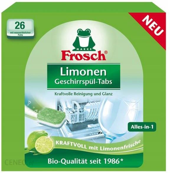 Frosch Limonen Geschirrspul Tabs 26 szt – Nowość – Oryginalne naturalne Niemieckie uniwersalne tabletki do zmywarek na bazie naturalnych skłądników i ekstraktu z Limonki. Uniwersalne tabletki do wszystkich typów zmywarek. Idealne do intensywnego czyszczenia. Nadają lśniącą czystość ze wszystkimi właściwościami nowoczesnych tabletek. Wyciąg z limonki zapewnia:silne oczyszczenie wszystkich naczyń w zmywarcerozpuszcza nawet zaschnięte pozostałościbrylantowy blask naczyń i szkła bez wodnych zaciekówbłysk naczyń już w 40º Cintensywny naturalny zapach limonki w zmywarce po myciuSkłąd:5 – 15% środka wybielającego oparty na tlenie,