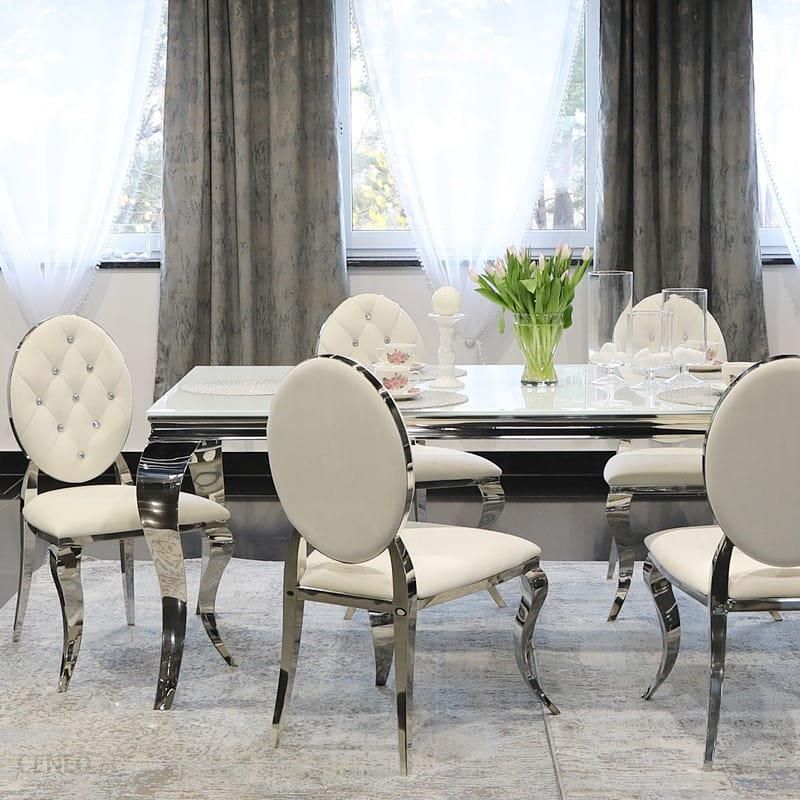 Jadalnia glamour Festa del Late – Mleczna UcztaPiękna jadalnia ze stołem Ludwik o klasycznej formie w nowoczesnej interpretacji w komplecie z blatem szklanym białym i mlecznymi krzesłami z kolekcji Ludwik II pikowanych kryształkami.Kolor biały i wszystkie jego odcienie są wręcz stworzone do dekoracji wnętrz. To kolory, które nigdy nie wyjdą z mody. Biel i jej odcienie nie znudzi się nigdy i zawsze będzie wygladała dostojnie. Barwy te doskonale współgrają ze stalowymi meblami, podkreślając ich piękno i szlachetność, optycznie powiększając pomieszczenie nadając mu jednocześnie lekkości i klasy. Kolory te są bardzo praktyczne, bo łatwo dopasować je do różnych stylów we wnętrzach. Jego neutralność i harmonijność daje duże pole do popisu w aranżacji naszego wnętrza. Biel komunikuje ciszę i spokój, pozwala się zrelaksować i wyciszyć umysł.Blaty szklane doskonale uzupełniają szlachetną formę podstawy, zapewniając jednocześnie trwałość i wygodę użytkowania na lata.* Istnieje możliwość wymiany koloru lub modelu krzeseł. Wymiana koloru lub modelu krzeseł może mieć wpływ na zmianę ceny zestawu.Prosimy o kontakt ze sklepem.