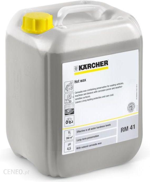 Środek do konserwacji i pielęgnaci lakieru. Na bazie naturalnego wosku Carnauba. Nadaje powierzchniom wysoki połysk. Lekko kwaśny (pH: 4.5 w koncentracie) wosk do stosowania na gorąco. Doskonały do konserwacji i pielęgnacji lakieru. Wyprodukowany na bazie naturalnego wosku Carnauba. Nadaje powierzchniom wysoki połysk. RM 41 przeznaczony jest do stosowania z urządzeniami wysokociśnieniowymi HDS. Przygotowanie: 1+3 Dozowanie: 1-2%