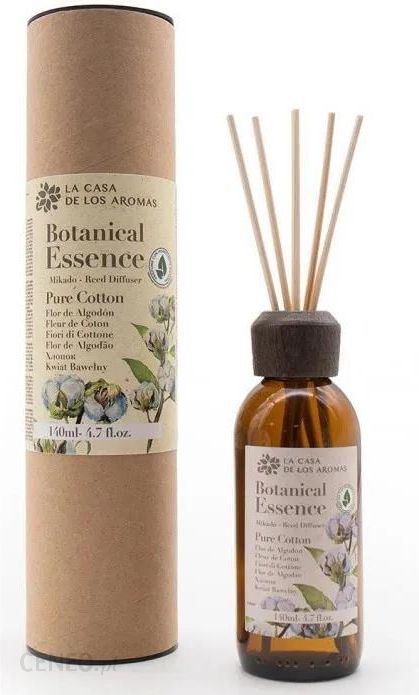LA CASA DE LOS AROMAS BOTANIC Patyczki zapachowe ŚWIEŻA BAWEŁNA, 140 mlSzukasz domu pełnego dobrych wibracji, z kwiatami na balkonie, roślinami w pomieszczeniach i aromatycznymi ziołami w kuchni?Uwielbiamy tę wersję Ciebie i dlatego opracowaliśmy ten wyjątkowy, zrównoważony produkt, składający się z naturalnych składników i kartonowego opakowania; idealny do ponownego wykorzystania i przechowywania rzeczy, użyj go jako elementu dekoracyjnego lub jak tylko chcesz.Dodatkowo nakrętka wykonana jest z drewna wenge, a patyczki z naturalnego rattanu, jednego z najbardziej wyszukanych. Zapomnij o materiałach syntetycznych. Bez wątpienia kolekcja elegancka, o aktualnej estetyce i dostosowana do każdego wnętrza. Postaw na naturalne!Nuty zapachowe:Nuty głowy: świeże, czyste, zieloneNuty ciała: kwiatowe, różane, ozonowe, brzoskwinioweNuty bazy: piżmoSposób użycia: Zdejmij nakrętkę z pojemnika. Włóż patyczki rattanowe do butelki, aby wchłonęły i uwolniły zapach w całym pomieszczeniu.Umieść w przewiewnym miejscu, aby lepiej rozprowadzić aromat po całym pomieszczeniu. Jeśli chcesz zwiększyć intensywność zapachu, możesz odwrócić patyczki.