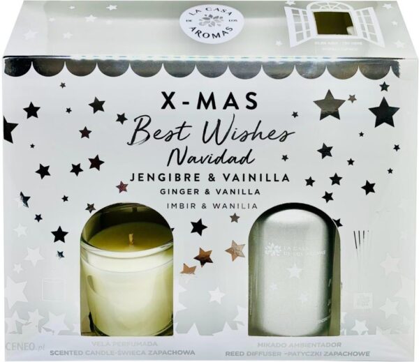 LA CASA DE LOS AROMAS zestaw o zapachu imbiru i wanilii składający się z patyczków zapachowych 100 ml oraz świecy zapachowej 65 g. Zestaw w ozdobnym opakowaniu zawiera świecę w bezbarwnym szkle oraz patyczki zapachowe w butelce o metalicznym, srebrnym wykończeniu.