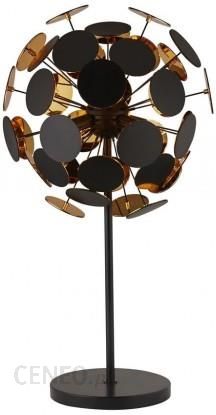 Lampa stołowa 3 punktowa z kloszem z tworzywa sztucznego. Klosz ma metalowe kolce z zaokrąglonymi końcami dysków i złotym lakierem wewnętrznym. Elementy metalowe lampy wykończone w kolorze czarnym.