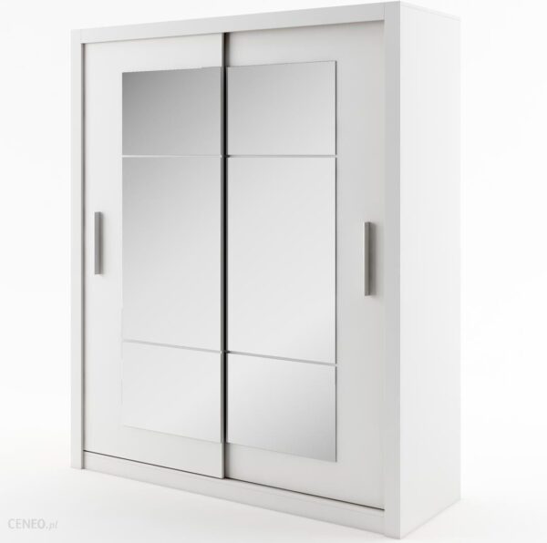 Szafa przesuwna, 2 lustra, Idea, 180x60x215 cm, biel, mat. Bardzo pojemna, nowoczesna szafa z dwojgiem drzwi przesuwnych, które świetnie oszczędzają przestrzeń. Idealnie sprawdzi się w każdej sypialni, garderobie przedpokoju, a nawet pokoju młodzieżowym.Modny, a jednocześnie uniwersalny design to zasługa prostej formy oraz sprawdzonych kolorów, w jakich dostępna jest szafa. Całość uzupełniają dwa duże lustra, które optycznie powiększają przestrzeń i pozytywnie wpływają na komfort korzystania z szafy. Wnętrze szafy skrywa dwa drążki na wieszaki oraz wewnętrzny regał z pojemnymi półkami, na których z powodzeniem zmieszczą się ubrania, a nawet walizki. Symetryczny układ mebla pozwala sprawiedliwie podzielić się miejscem z partnerem lub partnerką.Najważniejsze cechy szafy przesuwnej:Nowoczesny stylWysoka jakość wykonaniaInnowacyjne rozwiązanie kolorystyczneBardzo funkcjonalnaBardzo pojemnaIdealne uzupełnienie każdej sypialni, pokojuInstrukcja montażu w przesyłceMeble produkowane w PolsceDoskonale wpasowuje się w nowoczesne jak i klasyczne wnętrzeSolidne wykonanie, trwałość na lataGłębokie półkiMiejsce do wieszaniaDwa duże lustraSzafa pochodzi z kolekcji IdeaKorpus i fronty – płyta laminowana, dzięki której mebel ma mocną i solidną konstrukcjęObrzeża – wykończone wysokiej jakości tworzywem ABS o dużej wytrzymałości mechanicznej i chemicznejWymiary:Szerokość: 180 cmWysokość: 215 cmGłębokość: 60 cmGrubość płyty: 16 mmDopuszczalne obciążenie półki: 5 kgDodatkowe informacje:Meble należy czyścić za pomocą delikatnej ściereczki. Nie stosuj silnych środków myjącychMeble do samodzielnego montażu. W opakowaniu instrukcja montażu oraz wszystkie niezbędne elementy