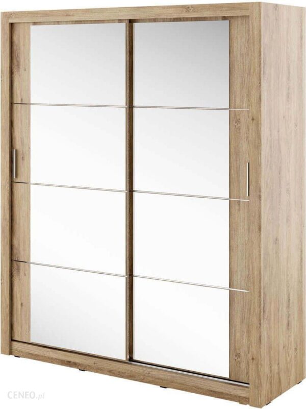 Szafa przesuwna 2D z lustrem, Arti, 180x60x215 cm, dąb shetland, mat. Pojemna szafa z dwojgiem drzwi przesuwnych i ergonomicznym układem funkcjonalnym. Dzięki nowoczesnemu, a jednocześnie uniwersalnemu stylowi pozwala na dużą swobodę w aranżacji. Dedykowany mebel idealnie sprawdzi się w każdym pomieszczeniu, w tym sypialni, garderobie, czy przedpokoju.Na frontach znajduje się tafla luster, która optycznie powiększa wnętrze, wprowadza do pomieszczenia więcej światła oraz dobrze wpływa na komfort używania mebla. Wnętrze szafy skrywa natomiast pięć pojemnych półek oraz dwa drążki na wieszaki, na których z powodzeniem można zawiesić płaszcze czy kurtki o różnej długości.Najważniejsze cechy szafy przesuwnej 2D z lustrem:Nowoczesny stylWysoka jakość wykonaniaInnowacyjne rozwiązanie kolorystyczneBardzo funkcjonalnaBardzo pojemnaIdealne uzupełnienie każdej sypialni, pokojuInstrukcja montażu w przesyłceMeble produkowane w PolsceDoskonale wpasowuje się w nowoczesne jak i klasyczne wnętrzeSolidne wykonanie, trwałość na lataMiejsce do wieszaniaDwa lustraSzafa pochodzi z kolekcji ArtiKorpus i fronty – płyta laminowana, dzięki której mebel ma mocną i solidną konstrukcjęObrzeża – wykończone wysokiej jakości tworzywem ABS o dużej wytrzymałości mechanicznej i chemicznejSprawdzi się jako w sypialni, garderobie oraz przedpokoju Wymiary:Szerokość: 180 cmWysokość: 215 cmGłębokość: 60 cmGrubość płyty: 16 mmDopuszczalne obciążenie półki: 5 kgDodatkowe informacje:Meble należy czyścić za pomocą delikatnej ściereczki. Nie stosuj silnych środków myjącychMeble do samodzielnego montażu. W opakowaniu instrukcja montażu oraz wszystkie niezbędne elementy