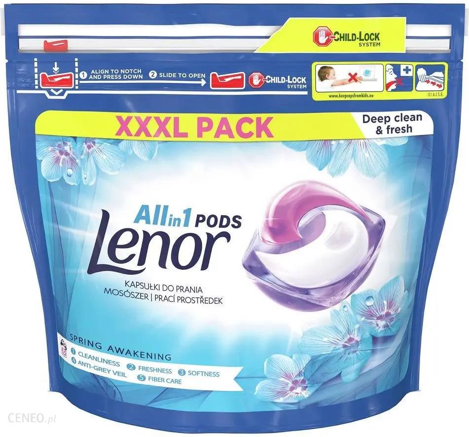 Kapsułki do prania Lenor Allin1 PODs Spring Awakening 63 zapewnią, że Twoje pranie będzie czyste i świeże. Ich zapach zawiera nuty kwiatowych perfum i bergamotki. Dodatkowo kapsułki zmiękczają pranie, chronią je przed szarzeniem i dbają o włókna. Produkt posiada opakowanie nadające się do recyklingu.