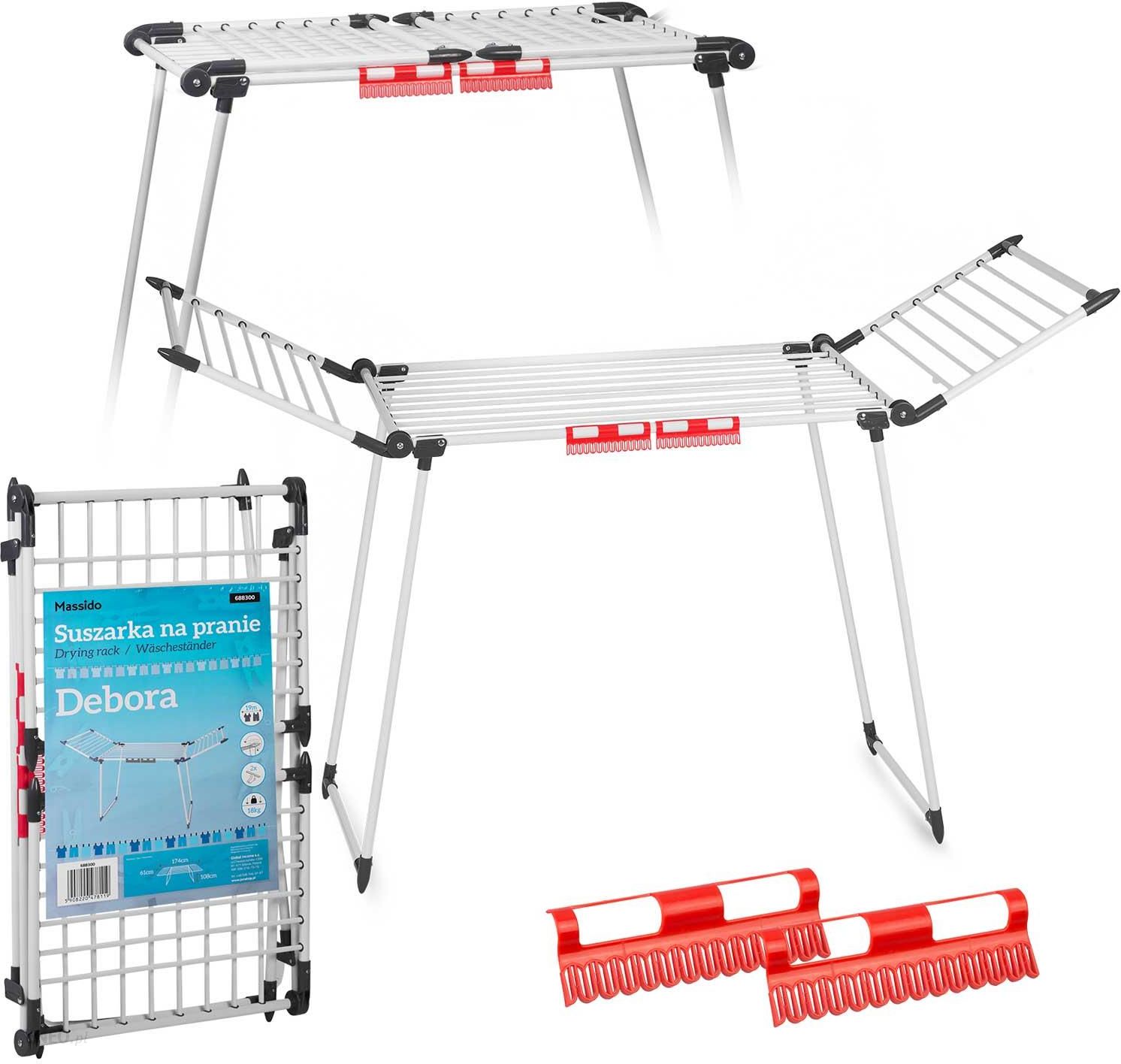 Suszarka na pranieduża powierzchnia suszenia – 19mb,2 rozkładane skrzydła,uchwyty na bieliznę,antypoślizgowe nóżki,szybkie składanie i rozkładanie.Praktyczne rozwiązaniauchwyty do suszenia bielizny- wieszając bieliznę na przeznaczonych do tego dodatkowych uchwytach zaoszczędzisz miejsce na suszarce,rozkładane/składane ramiona,antypoślizgowe nóżki.Raz, dwa – i gotowe!W suszarce do prania Massido szczebelki rozmieściliśmy w takich odległościach od siebie, aby pranie mogło swobodnie odparowywać i schnąć.Dzięki odpowiednim przestrzeniom pomiędzy linkami, woda szybko odparuje, a pranie będzie równomiernie wysuszone i gotowe do złożenia!