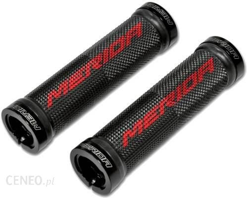 Chwyty Merida LK 2 pierścienie black/red Chwyty kierownicy Merida do rowerów trekkingowych i miejskich, które amortyzują wstrząsy przenoszone na dłonie rowerzysty. W chwytach wykorzystano gumę o twardości 55 A. Chwyty są wyposażone w 2 aluminiowe pierścienie poprawiające stabilność mocowania, z laserowo wycinanym logiem Merida. Długość: 130 mm Waga: 114 g