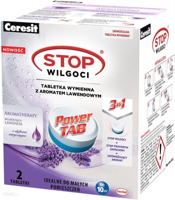 Tabletki Power Tab lawendowe 2 x 300 g Ceresit STOP Wilgoci PowerTAB 3w1 to innowacyjna trójfazowa tabletka o właściwościach aromatycznych. System 3w1 oznacza, że nie tylko skutecznie walczy z wilgocią, ale także neutralizuje niemiły zapach i wprowadza do pomieszczenia przyjemny aromat kojącej lawendy. Technologia PowerTAB sprawia, że wkład zapobiega również rozwojowi pleśni i grzybów, parowaniu okien, odklejaniu się tapet itd