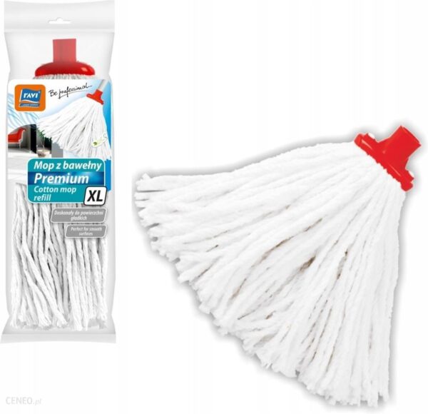 Wkład sznurkowy do mopa Premium XL Ekonomiczny, łatwy w użyciu i wytrzymały mop z bawełny. Bardzo dobrze chłonie wodę, usuwa mocne zabrudzenia nie pozostawiając smug. Sprawia, że sprzątanie staje się łatwe i przyjemne. W przypadku silnego zabrudzenia, można wyprać go w pralce w temperaturze 40°C. Końcówka z tworzywa zakończona gwintem ułatwia dopasowanie do niej każdego kija. Po użyciu zaleca się przechowywanie w miejscu z dostępem powietrza. Parametry: Kolor: biały Materiał wykonania: bawełna Nie rysuje powierzchni Długość mopa: 32cm Rozmiar: XL Sprzedawana sama końcówka bez drążka Końcówka z uniwersalnym gwintem ułatwia dopasowanie drążka (kija)