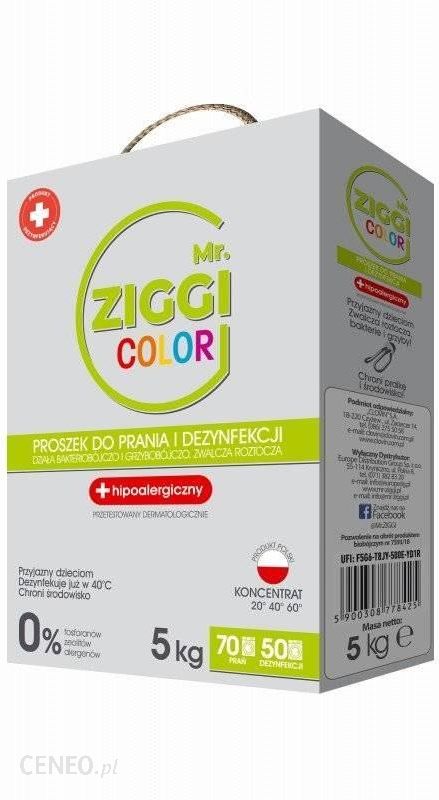 Proszek piorąco – dezynfekujący Mr. ZIGGI Color idealny do codziennego prania tkanin kolorowych. Hipoalergiczna formuła z aktywnym tlenem skutecznie odświeża białe tkaniny. Proszek ma właściwości dezynfekujące. Już w temperaturze 40 stopni Celsjusza zwalcza roztocza, bakterie, grzyby. Mr. ZIGGI White powstaje z myślą o środowisku naturalnym, dlatego nie zawiera fosforanów i zeolitów.• Innowacyjny skład środka piorąco – dezynfekującego Mr. ZIGGI sprawia, że w procesie prania zwalcza on roztocza, bakterie i grzyby już w 40°C. Jego właściwości dezynfekujące są dużym atutem w codziennym użytkowaniu i znajdują zastosowanie nie tylko w praniu ubrań, ale również ręczników, pościeli, czy też odzieży personelu medycznego, salonów fryzjerskich i SPA.• hipoalergiczny skład – nie zawiera alergenów mogących wywoływać uczulenia ani substancji podrażniających skórę,• bezpieczny dla każdego – proszek Mr. ZIGGI pozytywnie przeszedł standardowe testy płatkowe i koszulkowe, jak również bardziej zaawansowane badania dermatologiczne,• właściwości dezynfekcyjne – zwalcza bezpośrednie przyczyny alergii, czyli roztocza, bakterie i grzyby,• bez dodatkowych środków i wysokich temperatur – Mr. ZIGGI skutecznie dezynfekuje pościel i ubrania już w 40 stopniach Celsjusza,• delikatny dla tkanin i skóry – ma łagodny skład oraz naturalny, delikatny zapach.Wydajny i skuteczny:• wystarcza na dłużej – opakowanie 5 kg wystarcza aż na 70 prań,• jeszcze większa wydajność – do wyprania wkładu ubrań lub pościeli (4,5 kg) wystarczy tylko 71,4 g Mr. ZIGGI, podczas gdy producenci innych środków zalecają użycie od 75 nawet do 100 gramów proszku na jedno pranie.• wydajne pranie w niskich temperaturach – usuwa uporczywe zabrudzenia już w 20 stopniach Celsjusza, więc nadaje się również do delikatnych tkanin,• bez smug i osadów – proszek całkowicie rozpuszcza się w wodzie, pozostawiając tkaniny jak nowe.Przyjazny środowisku:• opakowanie przyjazne środowisku – materiały wykorzystane do produkcji opakowania pochodzą w 60% z surowców przetworzonych i nadają się w 100% do recyklingu,• nie zawiera fosforanów i zeolitów – starannie opracowany skład bez substancji szkodliwych dla środowiska,• energooszczędne metody produkcji – proszek powstaje przy wykorzystaniu tzw. metody suchej, co pozwala zredukować zużycie energii nawet o 70% (w porównaniu z konwencjonalnymi metodami)Wydajność: 70 prańWaga: 5 kg