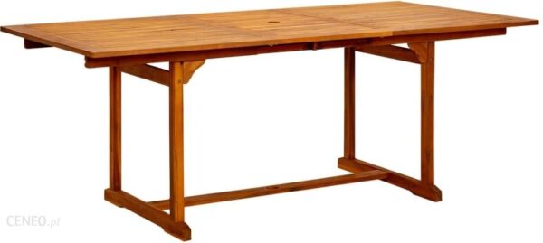 Drewniany stół jadalniany do ogrodu wniesie odrobinę rustykalnego uroku do Twojego ogrodu, na taras lub patio.Stół ogrodowy wykonano z litego drewna akacjowego – tropikalnego, twardego drewna, które jest odporne na warunki atmosferyczne i bardzo trwałe. Wykończona olejem powierzchnia ułatwia czyszczenie, wystarczy, że przetrzesz ją wilgotną ściereczką. Dzięki specjalnej konstrukcji stół można rozłożyć, gdy potrzebna jest dodatkowa przestrzeń.Uwaga: aby przedłużyć żywotność mebli ogrodowych, zalecamy ich regularne czyszczenie i niepozostawianie na zewnątrz bez właściwego zabezpieczenia.Czyszczenie: użyj roztworu wody z delikatnym detergentemPrzechowywanie: jeśli jest to możliwe, przechowuj produkt w chłodnym, suchym pomieszczeniu. Jeżeli ma on być przechowywany na zewnątrz, należy go zabezpieczyć wodoszczelną osłoną. Po deszczu lub śniegu należy usunąć nadmiar wody lub śniegu z płaskich powierzchni i osuszyć je. Należy też zapewnić wystarczającą cyrkulację powietrza, aby uniknąć uszkodzeń spowodowanych przez wilgoć.Materiał: lite drewno akacjowe, wykończone olejem Wymiary: (150-200) x 100 x 75 cm (dł. x szer. x wys.)Z możliwością powiększeniaWymagany montaż: tak