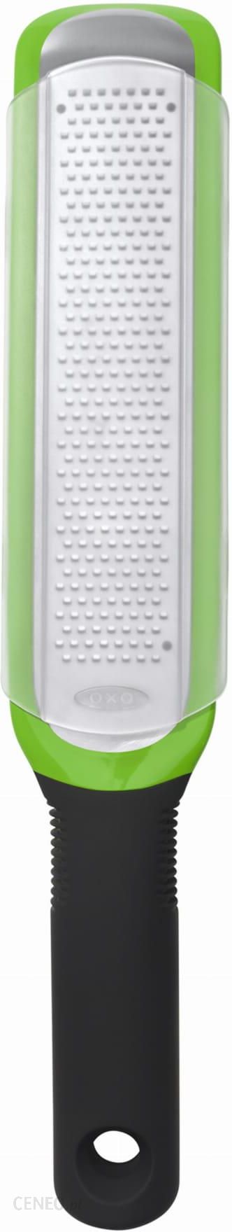 Oxo – Tarka Zester Etched – Good GripsTARKA DO CYTRUSÓW, CZOSNKU, TWARDEGO SERA, IMBIRU Ściera produkty na drobne wiórki i nitki Tarka z długim ostrzem o drobnych oczkach (Zester). Ścierany produkt nie jest rozrywany ani strzępiony, dzięki czemu zachowuje swój smak i aromat. Tarka jest wyposażona w miękki i wygodny, antypoślizgowy uchwyt oraz antypoślizgową krawędź górną, umożliwiające pewny chwyt i podparcie tarki o blat kuchenny w trakcie tarcia. Ostrze tarki zabezpieczone jest przezroczystą osłonką. Produkt wolny od BPA. Można myć w zmywarce.kolor:zielonywymiary:31 x 5,5 x 3,5 cm [dł. x sz. x wys.]materiał:stal nierdzewna, tworzywo sztuczne