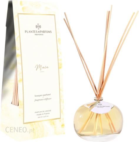 Odświeżacz powietrza z patyczkami znanego francuskiego producenta Plantes & Parfums PROVENCE o zapachu: Maia Maïa, jedna z najjaśniejszych gwiazd widzianych z Ziemi, to ciepły i musujący zapach. Przywołuje tajemnicze istoty, które ujawniają się pod osłoną nocy: zapach śniegu i drzewa sandałowego, oszronionych igieł sosny i cedru. Czysty i nieskończenie tajemniczy zapach na długie, gwiaździste zimowe wieczory. ekskluzywna seria Xmas 2021 Gwiazdozbiory Piramida zapachowa: Nuta głowy: żywica sosnowa, płatki śniegu Nuta serca: oszronione igły sosny Nuta głębi: mech dębowy, drzewo sandałowe, cedr Elegancko zapakowany zestaw zawiera: szklaną karafkę w kształcie kuli ze specjalnie spreparowanym patyczkami oraz wysokiej jakości wyrafinowaną kompozycją zapachową. Dyfuzor służy do aromatyzacji powietrza w pomieszczeniach. Pojemność dyfuzora to 100ml czyli ok 2 miesięcy działania. Po otwarciu karafki i włożeniu patyczków należy odczekać ok 24h, aby patyczki w pełni nasiąknęły. Intensywność zapachu reguluje się za pomocą ilości patyczków, zasada jest prosta – im więcej umieścisz patyczków w karafce z perfumami tym uzyskasz mocniejszy zapach. Patyczki należy co jakiś czas obracać. Po zużyciu kompozycji zapachowej można dokupić samo uzupełnienie – olejek do dyfuzorów dostępny w naszym sklepie w szerokiej gamie zapachów. Wyprodukowane ręcznie w Prowansji. Zawierają ekstrakty perfum z Grasse. Plantes & Parfums Provence to firma umiejscowiona w Sablet w sercu Prowansji która od 30 lat produkuje najwyższej jakości zapachy do wnętrz. Wszystkie produkty są wytwarzane lokalnie z poszanowaniem tradycji oraz środowiska naturalnego.