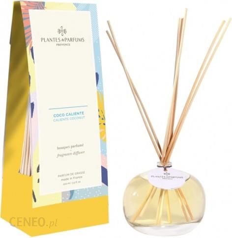 Odświeżacz powietrza z patyczkami znanego francuskiego producenta Plantes & Parfums PROVENCE o zapachu: Caliente Coconut – Upajający Kokos Egzotyczny zapach w hołdzie dla Kokosa, który od razu przeniesie Cię na tropikalną plażę na drugim końcu świata. ekskluzywna seria Spring/Summer Piramida zapachowa: Nuta głowy: mandarynka, imbir Nuta serca: kokos, wanilia, sól morska Nuta głębi: drewno kaszmirowe, szara ambra, piżmo Elegancko zapakowany zestaw zawiera: szklaną karafkę w kształcie kałamarza ze specjalnie spreparowanym patyczkami oraz wysokiej jakości wyrafinowaną kompozycją zapachową. Dyfuzor służy do aromatyzacji powietrza w pomieszczeniach. Pojemność dyfuzora to 100ml czyli ok 2 miesięcy działania. Po otwarciu karafki i włożeniu patyczków należy odczekać ok 24h, aby patyczki w pełni nasiąknęły. Intensywność zapachu reguluje się za pomocą ilości patyczków, zasada jest prosta – im więcej umieścisz patyczków w karafce z perfumami tym uzyskasz mocniejszy zapach. Patyczki należy co jakiś czas obracać. Po zużyciu kompozycji zapachowej można dokupić samo uzupełnienie – olejek do dyfuzorów dostępny w naszym sklepie w szerokiej gamie zapachów. Wyprodukowane ręcznie w Prowansji. Zawierają ekstrakty perfum z Grasse. Plantes & Parfums Provence to firma umiejscowiona w Sablet w sercu Prowansji która od 30 lat produkuje najwyższej jakości zapachy do wnętrz. Wszystkie produkty są wytwarzane lokalnie z poszanowaniem tradycji oraz środowiska naturalnego.