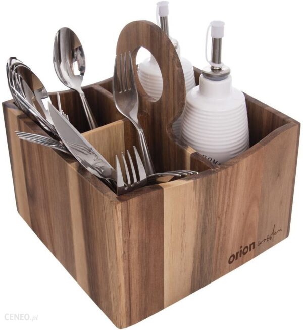 Stojak do przechowywania przyborów kuchennych. Materiał: drewno akacjowe. Wymiary: 18,5×18,5x22cm.