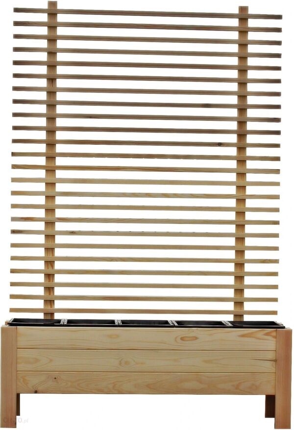 Donica surowa na wyższych nogach model W5D3N4 z pergoląwymiary donicy: 124x29x43 cm (szerokość x długość x wysokość)Wymiar całkowity donicy z kratką: 180x124x29 cm (wysokość x szerokość x długość)Nasze donice wykonane są z wysokiej jakości suszonego drewna sosnowego.Każda deska w procesie produkcji jest starannie szlifowana i fazowana.Donica przeznaczona jest do samodzielnego lakierowaniaDonica wyposażona jest w 5 wkłady z tworzywa sztucznego o wymiarach ok. 23x23x23 cm.KRATKA DONICY PRZEZNACZONA JEST DO SAMODZIELNEGO MONTAŻUElementy są nawiercone w odpowiednich miejscach także przy użyciu zwykłego śrubokręta gwiazdkowego skręcisz pergolę a następnie przytwierdzisz ją do donicy.W zestawie komplet wkrętów do donicy oraz pergoli