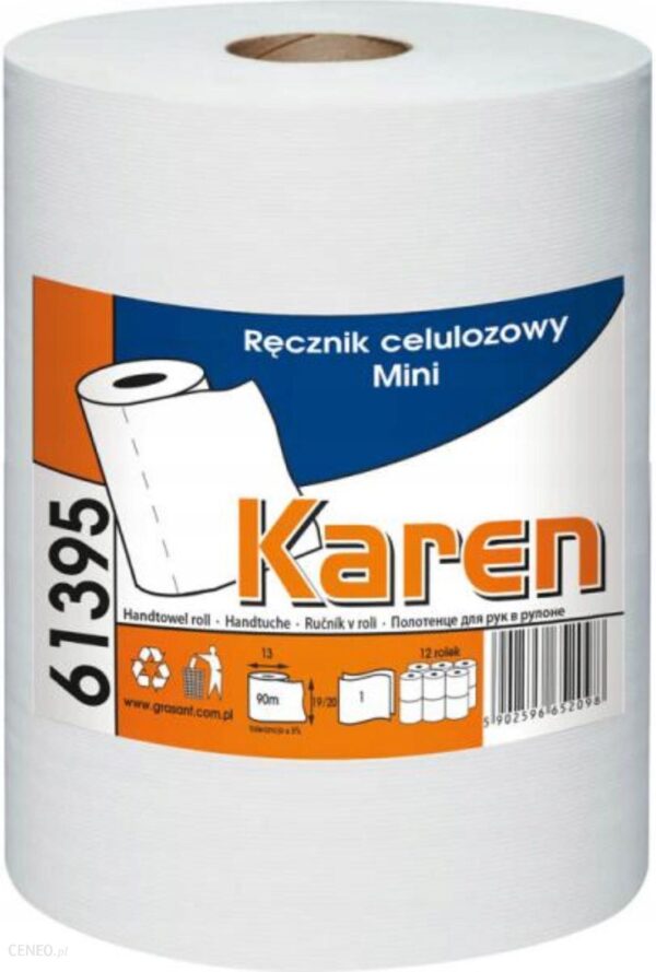 Ręczniki papierowe na roli Karen 61395. Ekonomiczne ręczniki papierowe, idealne do użytkowania w podajnikach.Kolor: białyIlość warstw: 1Szerokość roli: 190 lub 200 mmDługość: 90 m +/-5%