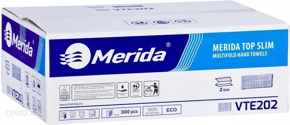 RĘCZNIKI PAPIEROWE SKŁADANE 3-PANELOWE MERIDA ONE TOP, BIAŁE, 100% CELULOZY, KARTON 3000 SZTUK, RĘCZNIKI PAPIEROWE SLIM BIAŁEsymbol produktu: VTE202OPIS PRODUKTUdwuwarstwowe, z eko celulozygofrowanemiękkie i chłonnebiałe, składane w „Z”testowane dermatologiczniedopuszczone do kontaktu z mokrą i suchą żywnościąposiadają certyfikat ekologiczny PEFCwymiary ręcznika rozłożonego 24 x 20,5 cm, złożonego 8 x 20,5 cmkarton zawiera 3000 szt. ręczników (25 pakietów po 120 szt.)Pasują do pojemników na ręczniki papierowe o symbolach:AEB101, AEC101, AHB102