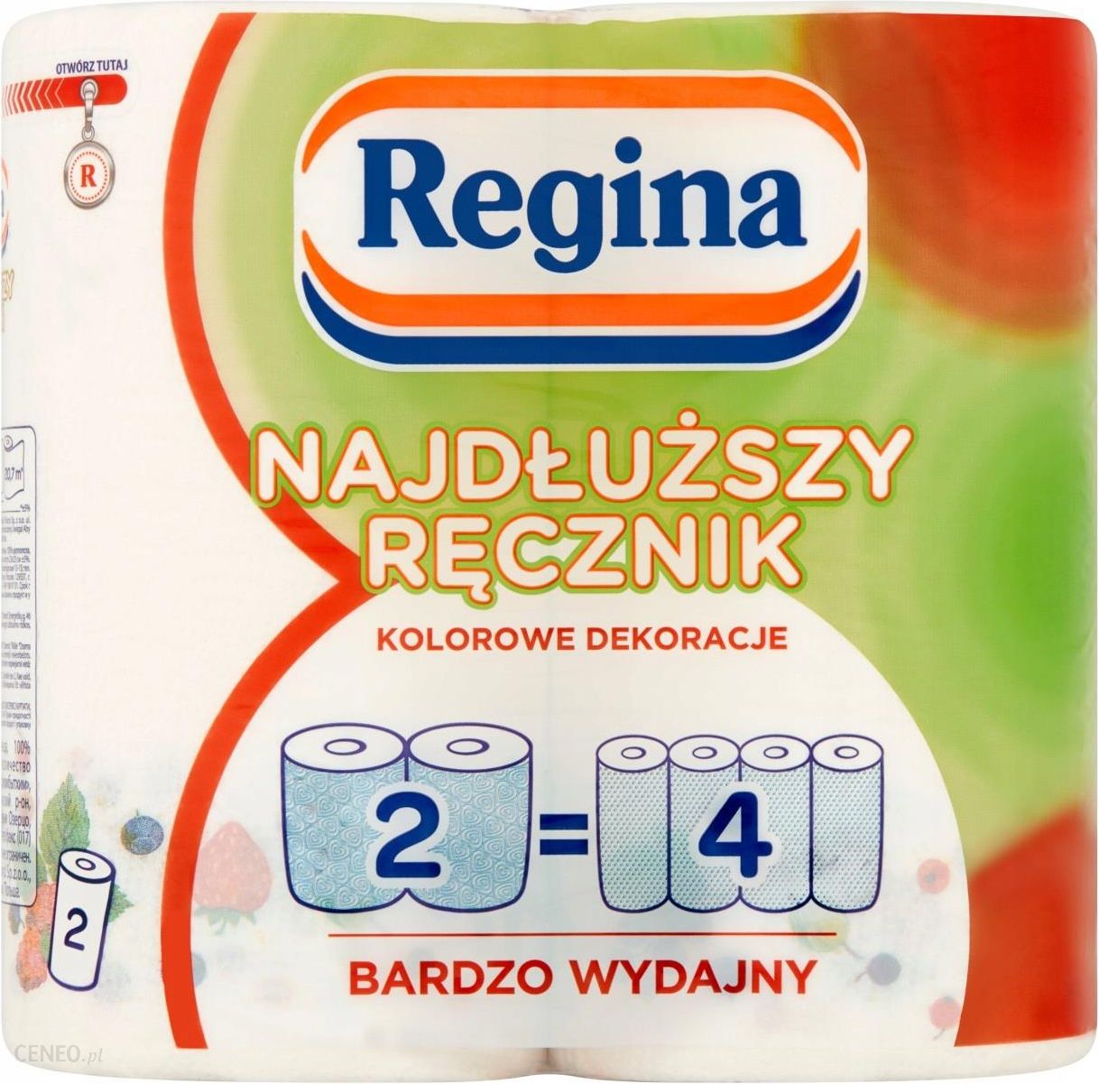 REGINANajdłuższy Ręcznik Uniwersalny 2 Warstwowy Z Nadrukiem – 2 Rolki (2=4)Produkty tej marki to istna delikatność dla skóry,kto raz pozna się na produktach Regina zostanie ich stałym zwolennikiem.W ofercie prezentujemy ręczniki kuchenne – wielofunkcyjne,dzięki którym wylana woda w kuchni, czy inne płyny na blacie kuchennymnie staną się problemem.Ponadto ręczniki kuchenne są wytrzymałe i subtelne,dzięki czemu wycierając w nie ręce nie powodujemy zniszczenia skóry dłoni.Ręczniki są bardzo wydajne i chłonne.Naturalną biel papieru uzyskano stosując wyłącznie włókna czystej celulozy.W opakowaniu znajdują się 2 rolki z nadrukiem,każda po 48 listków.WymiarWymagana wysokość na półce 233Wymagana szerokość na półce 247Wymagana głębokość na półce 134