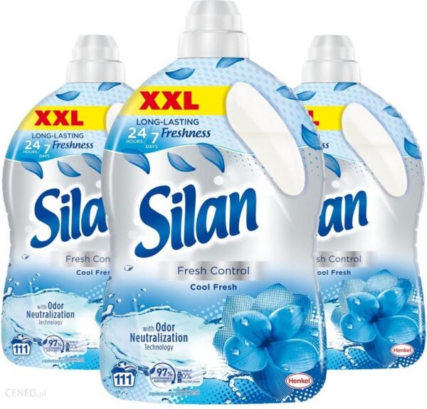 ZESTAW ZAWIERA:3 x Koncentrat do płukania tkanin Silan Fresh Control Cool Fresh 2775ml 111 prańPozbądź się nieprzyjemnych zapachów z Twoich ubrań!Płyn do zmiękczania tkanin Silan z nową formułą mikrokapsułek zapachowych. Zapewnia świeżość i zapach tkanin przez 24/7.Formuła jest wzbogacona o Technologię Neutralizacji Nieprzyjemnych Zapachów.Innowacyjne mikrokapsułki uwalniają zapach świeżego prania w wyniku tarcia podczas noszenia odzieży. W ten sposób każdego dnia możesz cieszyć się unikalnym zapachem świeżości.Delikatna formuła płynu o kremowej konsystencji zapewnia niesamowitą miękkość ubrań, chroni włókna i ułatwia prasowanie. Ponadto sprawia, że tkaniny mniej się elektryzują.Ponadto opakowanie jest przyjazne dla środowiska – butelka pochodzi w 50% z plastiku z recyklingu.Opakowanie jest też w 100% przeznaczone do recyklingu. Wystarczy zdjąć folię – zaleca się osobno segregować butelkę, owijkę i korek.Zalecane dozowanie