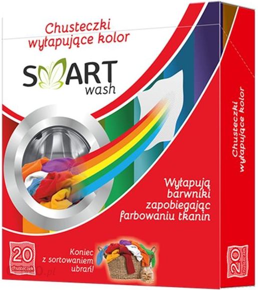 SMART WASH Chusteczki wyłapujące kolor 20 sztukSMART Wash Chusteczki wyłapujące kolor skutecznie wyłapują barwniki zapobiegając farbowaniu tkanin. Barwiące tkaniny mogą być uciążliwe podczas wykonywania codziennego prania. Do tej pory wymagały one czasochłonnego segregowania na podobne kolory. Z chusteczkami wyłapującymi kolor można baz obaw prać razem nawet kolorowe ubrania. Chusteczkę wkładamy do bębna pralki przed włożeniem prania. Używamy detergentu do prania jak zwykle i nastawiamy cykl prania. Po zakończonym praniu wyrzucamy chusteczkę. Chusteczki działają jak magnes wyłapując barwniki i brud unoszący się na wodzie. Chusteczki są odpowiedni do prania w pralce i prania ręcznego. Produkt biodegradowalny i bezpieczny dla środowiska.wyłapują barwniki zapobiegając farbowaniu tkaninidealne do prania ręcznego i prania w pralcebiodegradowalne i bezpieczne dla środowiska