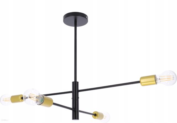 Lampa sufitowa wisząca w kolorze czarnym ze złotymi elementami.Parametry przedmiotuModel: LAMPA 2128Materiał: StalKolor: Czarny + złotyŹródło światła w komplecie: BrakRozpiętość lampy: 72x51cmW zestawie znajdują się trzy łączniki o długościach: 2x 30cm oraz 15 cm. Dzięki temu możliwe jest uzyskanie różnych wysokości lampy. Od 35 cm do 95 cm.Źródło światła: 4xŻarówka E27 moc maksymalna 60W lub LED 20WLampa idealna do niebanalnych wnętrz, pasuje do nowoczesnych jak i loftowych pomieszczeń. Do lampy pasują wszystkie najpopularniejsze żarówki z gwintem E27 (wszystkie z naszych aukcji) o maks. mocy żarówki 60W. Lampa wykonana z metalu.