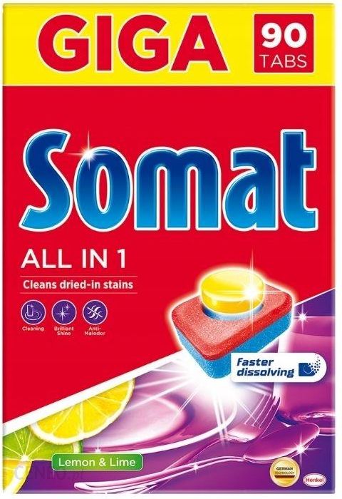 Somat All in One Tabletki do zmywarki 90 sztSilne działanie czyszczące: Tabletki Somat All in 1 usuwają nawet ciężkie przypalenia, pozostawiając Twoje naczynia za każdym razem idealnie czyste i lśniące.Bez potrzeby wcześniejszego namaczania: Tabletki Somat usuwają nawet zaschnięte resztki jedzenia.Bez pozostałości po tabletce: Somat All in 1 pozostawia Twoje talerze, sztućce i szklanki idealnie lśniące, bez śladu zacieków!Do wszystkich naczyń: Tabletki można bezpiecznie stosować do wszystkich naczyń przeznaczonych do zmywarki: szklanek, kubków, butelek, sztućców, garnków i patelni. Wszystkie butelki i naczynia dla niemowląt można również umieścić z pozostałymi naczyniami w zmywarce.Przyjazny dla środowiska: Karton Somat jest stworzony w 80% z recyklingu oraz w pełni nadaje się do recyklingu.Dzięki tabletkom do mycia naczyń Somat All in 1 doświadczysz silnej i skutecznej mocy czyszczenia. Skuteczna i szybka formuła Somat All in 1 usuwa najcięższe przypalenia oraz plamy po herbacie i kawie. Formuła Somat All in 1 szybko się rozpuszcza i działa natychmiastowo. Tabletki do mycia naczyń Somat można bezpiecznie używać do wszystkich naczyń przeznaczonych do zmywarki: talerzy, szklanek, kubków, butelek, sztućców, garnków i patelni. Tabletki do zmywarki nie pozostawiają po sobie żadnych niepożądanych śladów. Tabletki Somat All in 1 sprawią, że Twoje naczynia i szklanki są lśniąco czyste po każdym cyklu zmywania.Bez potrzeby namaczaniaDzięki silnemu działaniu czyszczącemu, Somat All in 1 usuwa nawet ciężkie pozostałości posiłku oraz tłuszcz, bez wcześniejszego namaczania.Idealny połysk wszystkich naczyńSomat All in 1 zapewni Twoim talerzom, sztućcom i szklankom olśniewający połysk.Technologia neutralizująca zapachyPożegnaj się z nieprzyjemnymi i niechcianymi zapachami. Somat All in 1 neutralizuje je wszystkie podczas cyklu zmywania.Przyjazny środowiskuKarton Somat All in 1 jest wykonany w 80% z papieru z recyklingu i może być w pełni poddany recyklingowi.Sposób użycia:Po prostu wyjmij tabletkę z opakowania, zdejmij folię i umieść w komorze dozującej. Po użyciu zamknij ponownie opakowanie i przechowuj w suchym i ciemnym miejscu.Rekomendacje:W przypadku twardej wody > 21°n zalecamy stosować nabłyszczacz i sól Somat. Nie zapomnij o pielęgnacji zmywarki: tabletki do czyszczenia Somat Duo Machine Cleaner i środek Somat Intense Machine Cleaner Ci w tym pomogą!Czym jest Somat?Od 1962 roku Somat, marka firmy Henkel, jest ekspertem w dziedzinie automatycznego zmywania naczyń, zapewniającego doskonałe rezultaty bez konieczności wstępnego i późniejszego mycia.Dzięki ponad 50-letniemu doświadczeniu i niemieckiej technologii, Somat koncentruje się na potrzebach konsumentów i innowacyjności. W trosce o ochronę środowiska w kwietniu 2016 r. Somat wprowadził nowe standardy jakości swoich produktów, które nie zawierają fosforanów. Somat oferuje szeroką gamę środków czyszczących i dodatków do zmywarek, w tym innowacyjne produkty, takie jak tabletki Somat Gold z 12 funkcjami umożliwiające skuteczne usuwanie przypaleń.