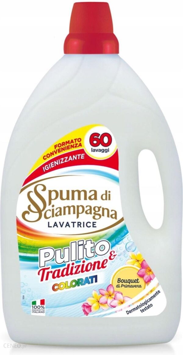 Spuma di Sciampagna Color – Płyn do prania ubrań kolorowych (3L – 60p)Idealny do prania różnokolorowych ubrań. Specjalna formuła zapobiegania wzajemnemu barwieniu tkanin.Usuwa zabrudzenia już w niskich temperaturach. Pozostawia przyjemny wiosenny zapachTestowany dermatologicznie.