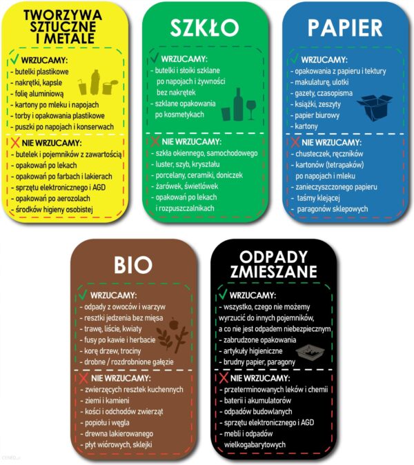 Zestaw 5 szt. dużych naklejek nakosze do segregacji odpadówWymiary każdej naklejki:- wysokość 30 cm- szerokość 17 cmNaklejki mają kolorystykę i treść zgodne z najnowszymi wytycznymi odnośnie segregacji odpadów.W skład zestawu wchodzą naklejki z oznaczeniami:tworzywa sztuczne i metaleszkłopapierbioodpadyodpady zmieszaneNaklejki mają błyszczące wykończenie powierzchni folii dodatkowo uodparnia wydruk na osadzanie się na nim kurzu. Naklejka posiada zaokrąglone rogi, dzięki czemu jest znacznie trwalsza niż naklejki prostokątne.Nowoczesny design, jasne kolory, czytelny tekst i duży rozmiar.Naklejki nadają się na wszelkie gładkie powierzchnie – będą trzymały się plastiku, metalu, szkle, plexi, kartonie, itp.Naklejanie jest bardzo proste – należy oczyścić powierzchnię kosza z pyłu i odtłuścić ją (na przykład alkoholem).Następnie wystarczy odkleić naklejkę od papieru zabezpieczającego i umieścić ją na koszu.Zalecana temperatura naklejania: powyżej +10°C. W przypadku naklejania w niższej temperaturze zalecamy po naklejeniu rozgrzanie naklejki suszarką i ponowne dociśnięcie.