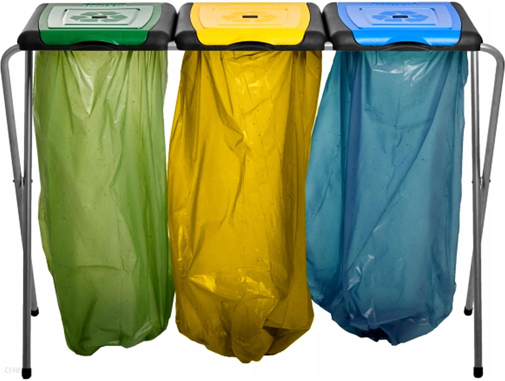 SUPER ZESTAW! STOJAK + 3 ROLKI WORKÓW NA ŚMIECI 120 LSTOJAK NA WORKI DO SEGREGACJI ODPADÓW ECOselect to zewnętrzny stojak na śmieci polskiej firmy EuroTools. Składa się z solidnego i mocnego stelaża, na którym umieszczono trzy plastikowe pokrywy w kolorze żółtym, zielonym, oraz niebieskim. Pokrywy wzbogacone są w wewnętrzne pierścienie mocujące worki oraz piktogramy symbolizujące zbieraną frakcję odpadów – PLASTIK, PAPIER, SZKŁO. Stojak na śmieci przystosowany jest do worków o pojemności od 35 l do 120 l. Znakomicie funkcjonuje w garażach, domach, ogródkach oraz firmach.STOJAK NA WORKI DO SEGREGACJI ODPADÓW ECOselect cechuje się:2-letnią gwarancjąsolidnym stelażem wykonanym z lakierowanych proszkowo rurek o dużej średnicy fi 19 mmgumowymi nóżkamitrwałą i stabilną konstrukcją przenoszącą duże obciążeniażółtą, zielona, brązową oraz niebieską pokrywą wykonaną z wysokiej jakości tworzywa sztucznego, wzbogaconą w pierścień mocujący worekplastikowymi piktogramami frakcji umieszczonymi na pokrywachprzystosowaniem do worków o pojemności od 35 l do 120 lwymiarami: szerokość 149 cm , głębokość 37 cm , wysokość 85 cm.W ZESTAWIE TANIEJ! W komplecie wraz ze stojakiem znajdują się 3 rolki worków na śmieci wykonane z bardzo mocnej folii LDPE. Worki posiadają następujące kolory: zielony, żółty, niebieski. Każda rolka zawiera 25 sztuk worków.