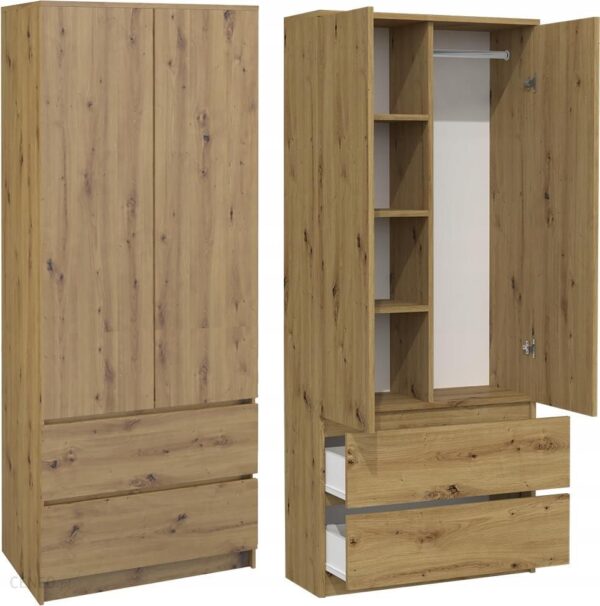 Korpus i fronty– płyta wiórowa laminowana o grubości 16mm.Obrzeża – wykończone tworzywem PCV (charakteryzującym się dużą wytrzymałością mechaniczną i chemiczną)Szuflady – na prowadnicach rolkowych to gwarancja wygodnego, a przede wszystkim bezpiecznego użytkowania.WYMIARY:Głębokość: 50 cmSzerokość: 90 cmWysokość: 180 cmSystem TIP-ON drzwi szafy – otwierają się po delikatnym naciśnięciu frontu za pomocą mechanicznego wspomagania otwierania.Możliwość montażu półek z lewej bądź prawej strony.Krawędzie oklejone obrzeżem ABSMiejsce na powieszenie ubrań4 półki2 szufladyLekka prosta formaMinimalistyczna konstrukcjaPolski producent